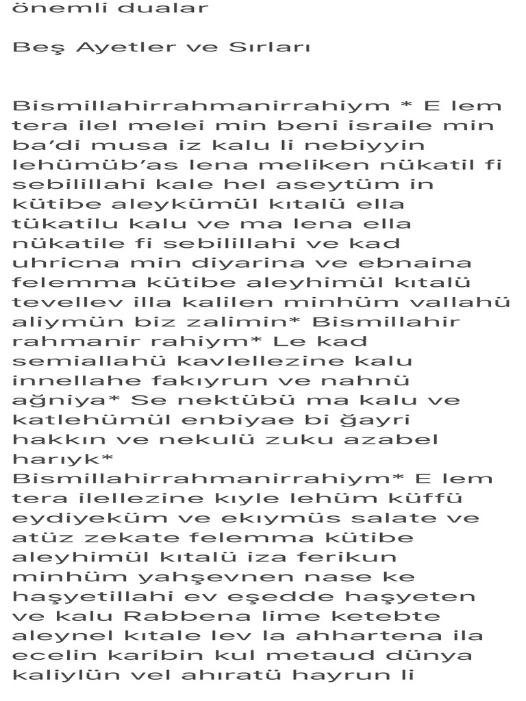 Kur an ı kerim de tesiri büyük öyle beş ayet vardır ki okuyanı allah ın izni ile korkulan şeylerden emin kılar bütün elem verici şeylere ve hastalıklara karşı koruyucu bir manevi kalkan vazifesi görür hazreti i̇bn i mes ud r a dan rivayetle. Beş ayetler ve sırları bismillahirrahmanirrahiym e lem tera ilel melei min beni israile min ba di musa iz kalu li nebiyyin lehümüb as lena meliken nükatil fi sebilillahi kale hel aseytüm in kütibe aleykümül kıtalü ella tükatilu kalu ve ma lena ella nükatile fi sebilillahi. İmam ı buni hazretleri diyor ki. Gulillēhu k hâligu külli şey iv ve hüvel vâhidul kahhâr.