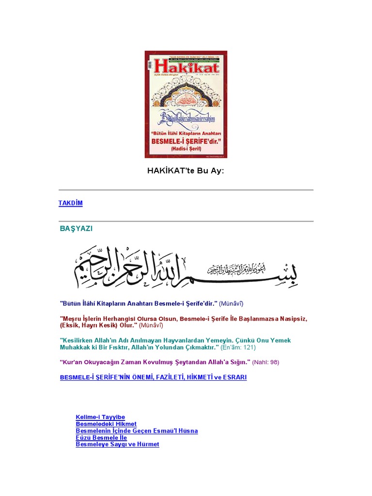 Bismillahirrahmanirrahim süleyman a s ve sonra resulullaha s a v inen muazzam şifa ve sır kaynağıdır. Allah الل ismi ya o nun yüce zatına nazarla ya da kuddûs gibi selbî alîm gibi sübûtî veya hâlık gibi fiilî sıfatlarına itibarla kullanılan bir isimdir. Kur ân mahlûkâtın bütününe hâkim olan vâhidiyet içinde akılları boğmamak için her bir şeyde ehadiyet cilvesini gösteriyor. Zikr edilen ismi şerifi ise sonrasında zikr.