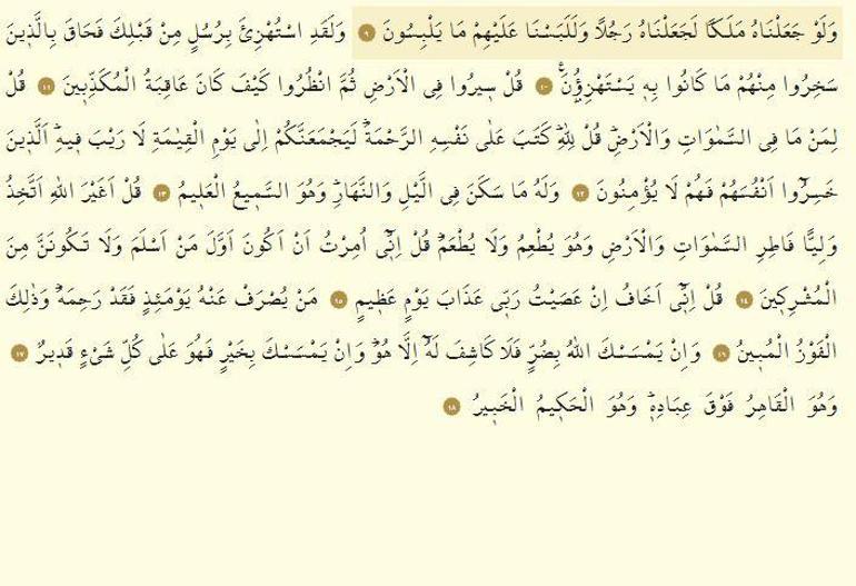 Ayetini okumaya devam ederse her türlü maddi ve manevi hastalıklardan şifa bulur. Kur anla ve sünnetle bir ömür geçirseydik büyük ihtimalle iki cihanda da mesut yaşardık diye düşünüyorum. Her kim iki rekat nafile bir namaz kılar zamm ı sure olarak enam suresini okur namazdan sonra dua ederse duası bi iznillah kabul olur ve her türlü sıkıntı ve kötülüklerden muhafaza olur. Yetmiş bin 70 000 melek tesbih ve hamd sözleriyle bu surenin inişine eşlik etti resulullah sallallahü aleyhi ve sellem buyurdu ki.
