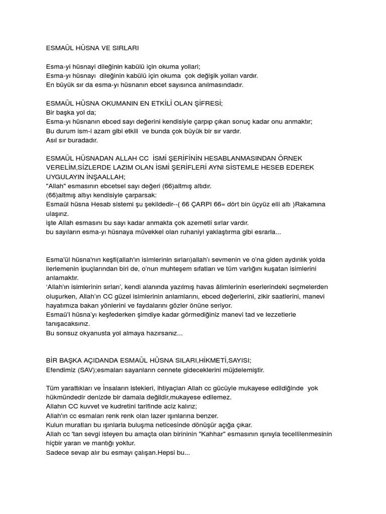 Esma i hüsna terkibi isim kelimesinin çoğulu olan esma isimler nitelikler ile güzel ve en güzel anlamına gelen gerek sıfat gerekse ism i tafdil olarak kabul edilen hüsnâ el hüsnâ. Kıyamet günü hesabın kolay geçmesi için. Bu sayılarda mucize sırlar vardır. Doğaüstü güçlere sahip olmak isteyenlerin vazgeçilmezi.