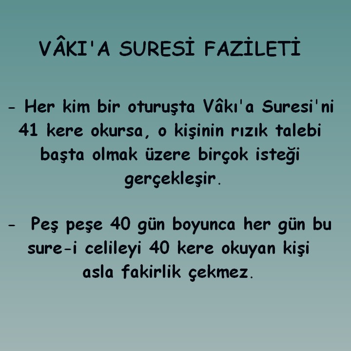 Vakıa suresi nin fazilet ve sırları resulullah sallallahü aleyhi ve sellem buyurdu ki. Sırları ve faziletleri not. Bilhassa zenginligi celbetmek ve fakirligi defetmekle ilgili çok büyük bir fazileti vardır.