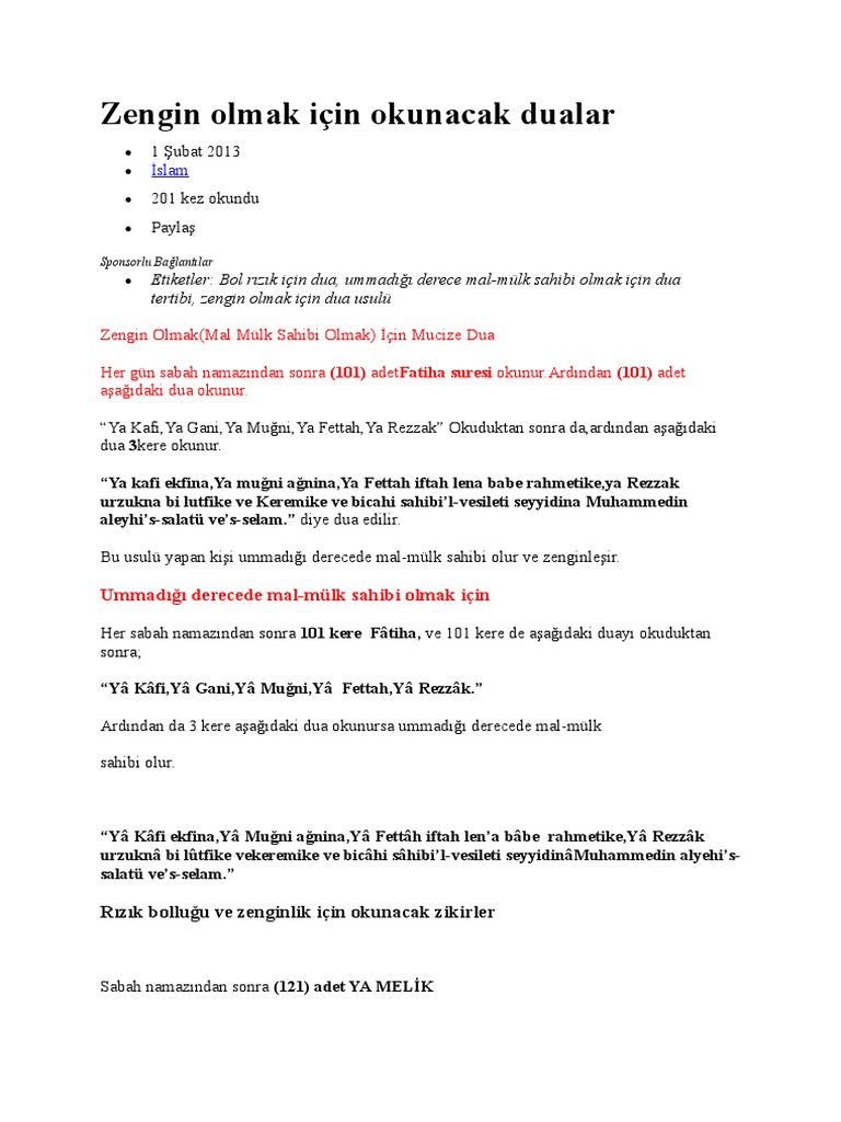 Zenginlik isteyen için dua zenginlik isteyen 10 hafta boyunca cuma günleri 10 defa ya ganiyy ya muğni esmalarını okumalıdır bu ismi kendisine vird edinenin malı mülkü para ve serveti çoğalır. 10 hafta süreyle her cuma günü yâ ganiyy yâ muğni esmasını okuyanlar zengin olurlar. Selam yönetici kardeşim ya ganiyy ya muğni diye okusak olurmu sabah vaktinde az oluyor başka dua ve zikirlerin okumaya zaman kalmıyor birde neden bilmiyorum uykumuzu alamıyorum nedendir esma ve duaları okurken uyku bastırıyor uzun okunan zikir dualar teşekkür şimdiden allah razı olsun sizlerden. Zenginlik isteyen için dua zenginlik isteyen 10 hafta boyunca cuma günleri 10 defa ya ganiyy ya muğni esmalarını okumalıdır.