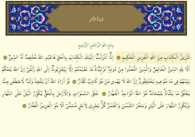Zümer suresinin sırrı havası ve faziletleri zümer süresini okumaya devam eden kimse hak katında aziz olur ve kerem i i̇lahiye nail olur. 2 vücudunun herhangi bir yerinde ağrı olan kişi bir kap içersine yunus suresinin 12. Yaratılan binlerce canlı içerisinde akıl ve şuur sahibi olan ve aynı zamanda hz. Ayeti kerimesini mürekeble yazıp zeytinyağı doldurur ve o kabı ateşte ıstttıktan sonra ağrıyan yerin üzerine sürmelidir.
